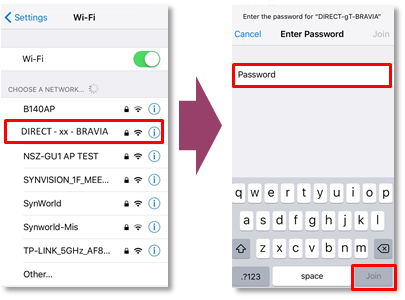 Enter the WPA key password displayed on the TV screen then tap Join. If you need to perform a task that requires connectivity between two Wi-Fi capable devices eg printing files from your device view this info on Wi-Fi Direct. Tap Direct-xx-BRAVIA on the iPhones screen to display the password input screen.